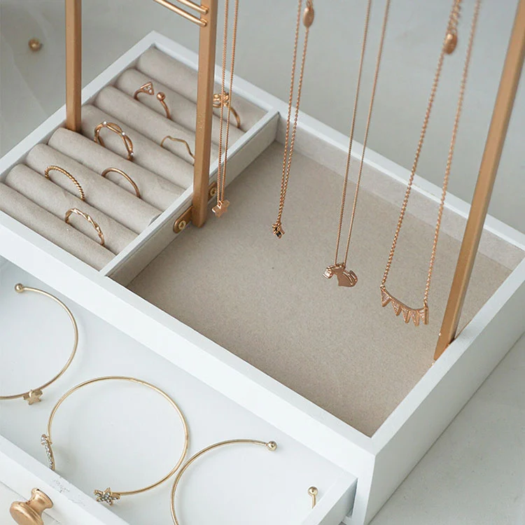 พื้นที่แสดงแบบเปิดชั้นบน: กรอบโลหะสีทอง เหมาะสำหรับแขวนสร้อยคอ ต่างหู และสร้อยข้อมือ มองเห็นได้ง่ายและสามารถเข้าถึงได้ตามต้องการ
